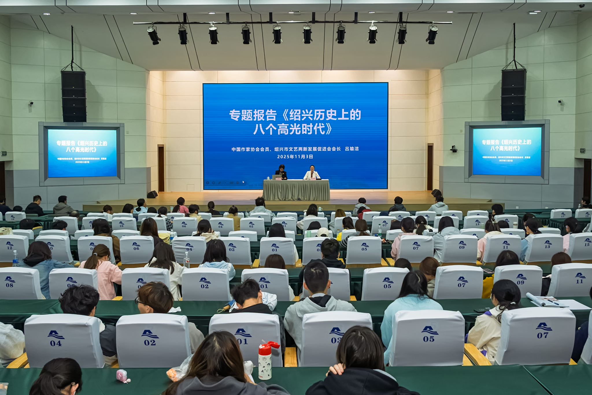 为进一步增强学生的获得感,提升《思想道德与法治》课的教学实效,推进专家进校上课常态化。赵浪平副校长特邀请绍兴市文艺两新发展促进会会长吕瑜洁作家进校上课。讲座主题是“绍兴历史上的八个高光时代”,讲座于2025年11月3号上午在河西校区铁城报告厅举行。授课对象是(国际经济与贸易251,国际经济与贸易(中英)252;工商管理252;公共事业管理251/252)。吕会长从绍兴的八个高光时代,采用问题探究的方式,在和学生不断互动的过程中,生动讲述了绍兴的历史、人文和绍兴精神。吕会长作为专业作家,用生动形象叙事带着同学们在精神的世界里遨游了绍兴的过去、现在与未来,增强了青年大学生对绍兴的归属感、认同与荣誉感,深得同学们的喜爱。(供稿人:张灵)