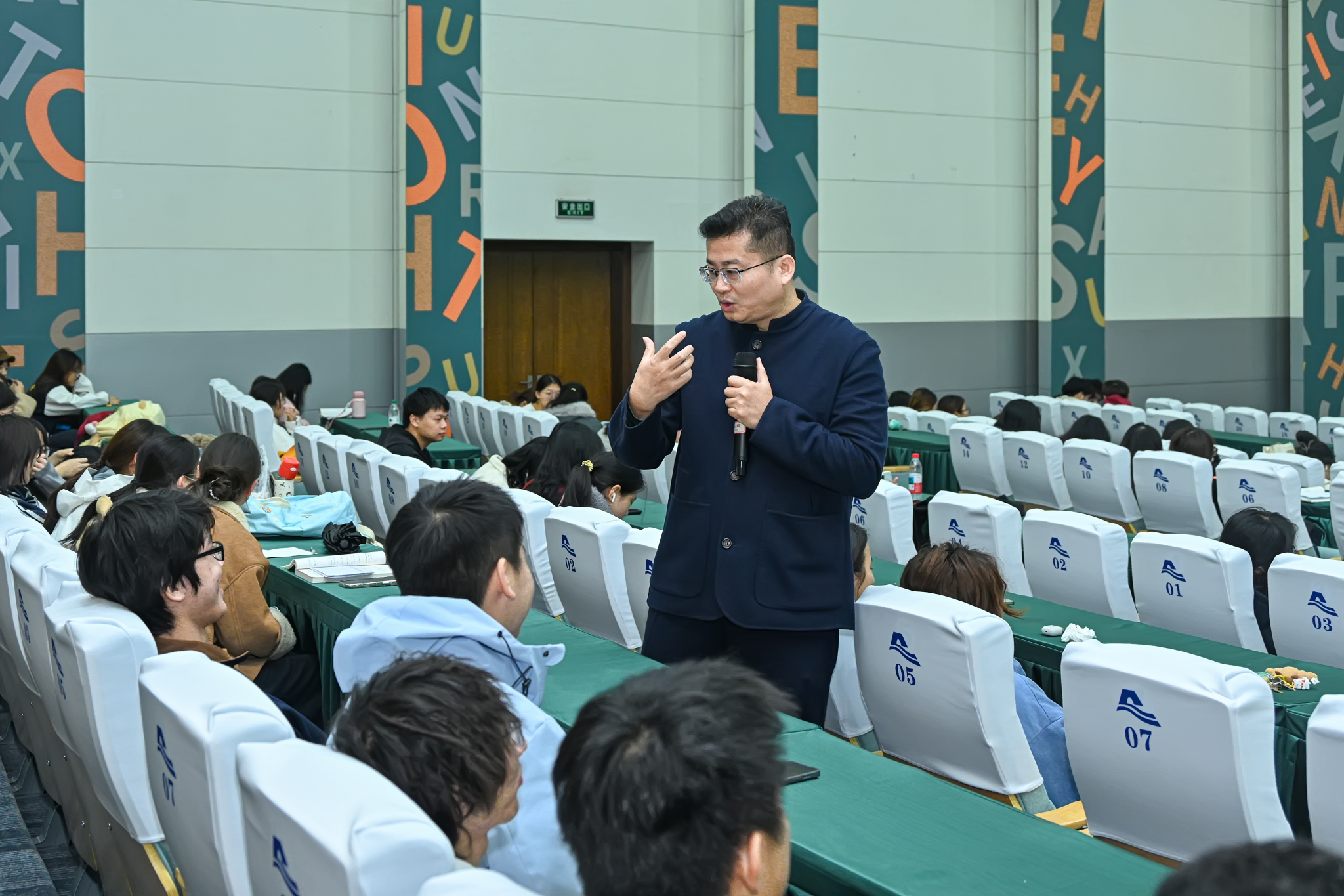为增强学生的获得感,提升《思想道德与法治》课的教学实效。赵浪平副校长特邀请绍兴文理学院商学院(法学院)法治研究院院长朱淼蛟于2025年11月17日上午在河西校区铁城报告厅给大学生(国际经济与贸易251,国际经济与贸易(中英)252;工商管理252;公共事业管理251/252)上了一堂生动的科技发展与法治关系的法治课。朱院长采用问题链的方式,从五层问题,层层剥笋方式,从理论逻辑到实践层面讲述了科技的发展对法治领域的机遇与挑战,最后提出了作为青年一代,我们需要如何应对的策略。朱院长精彩的演讲和多样化的互动,深得同学们的喜爱。(供稿人:张灵)