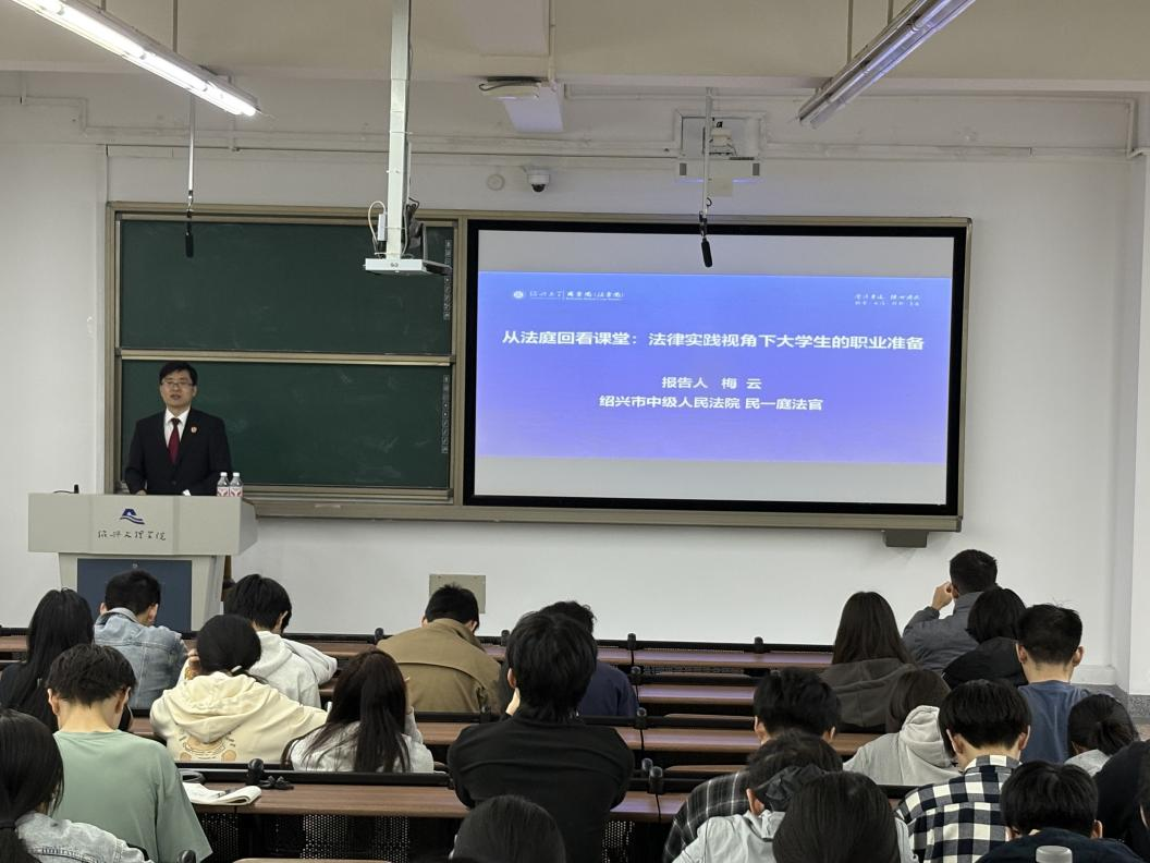 为深化《思想道德与法治》课程内涵,帮助大学生提高法治素养,赵浪平老师特邀绍兴市中级人民法院民一庭资深法官梅云,于2026年4月22日下午在南山6号楼A303,为机器人工程251班全体同学上了一堂生动的法治课。讲座主题是《从法庭回看课堂:法律实践视角下大学生的职业准备》。梅云法官长期奋战在民商事审判第一线,审理过大量涉及合同、侵权、家事、劳动争议等与民生密切相关的案件,实务经验丰富。梅云法官以自身多年一线审判经验为引,打破“课堂知识”与“法庭实践”的壁垒,用一个个鲜活的民事审判案例,让同学们直观感受到“法律不是冰冷的条文,而是解决纠纷的温暖工具”。他提到,自己办理的很多民事案件,调解比判决更能化解矛盾,但调解过程需要付出比判决多几倍的耐心与沟通成本,而这份耐心,正是从一次次倾听、一次次解释中慢慢练就的。他鼓励同学们在大学阶段多参与社会实践活动,在实践中学会沟通、学会共情,提前适应职业的节奏与挑战。梅云法官的话语,让在场的同学们深受触动。现场掌声不断,不少同学表示,这场讲座打破了自己对法律职业的刻板印象,也让自己对未来的职业规划有了更清晰的方向。