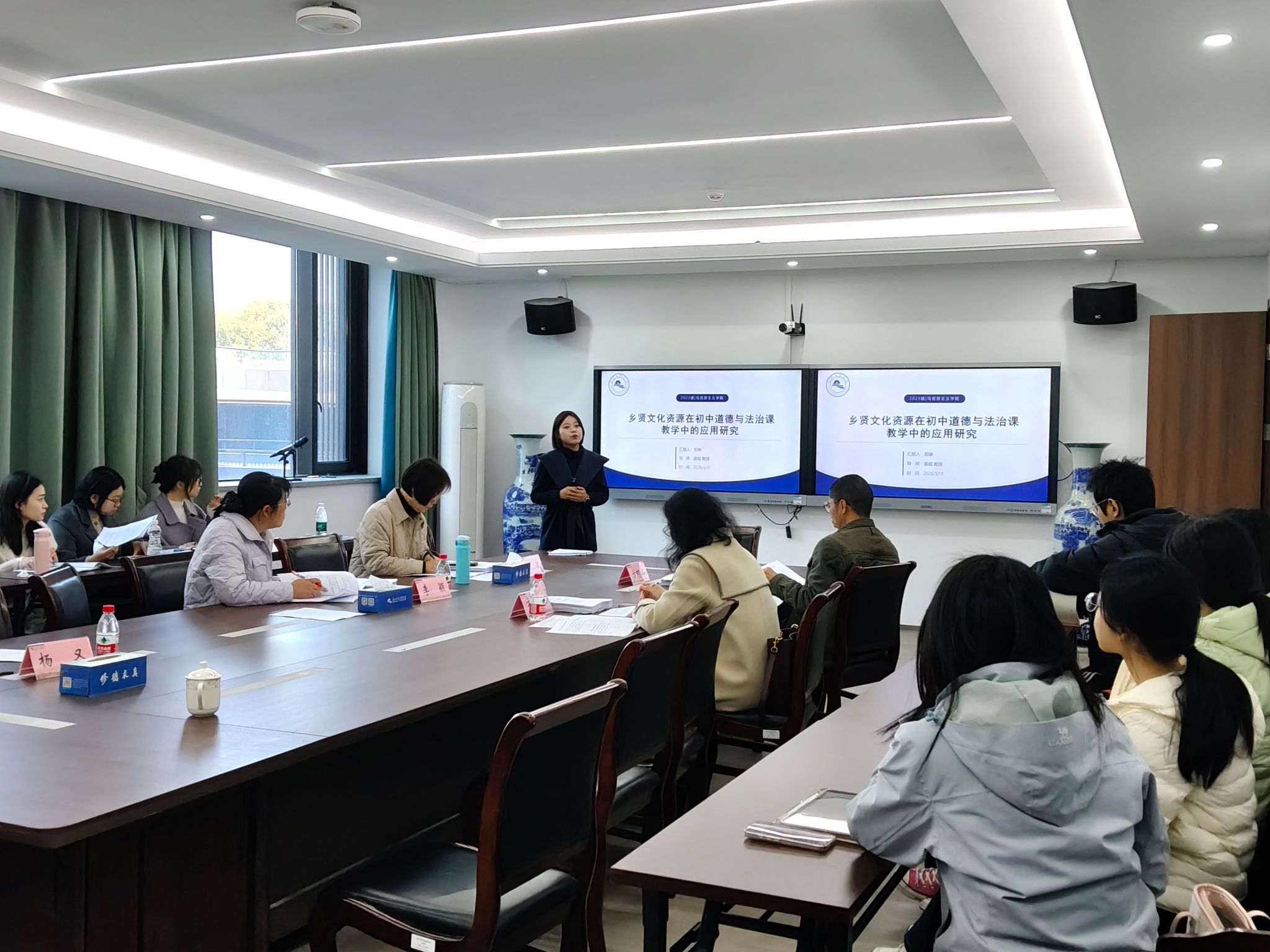本次预答辩按研究方向分两组进行,13名研究生依次汇报。评审组由方环非教授等八名校内导师评委,以及方谊、吴益妃两位校外专家评委共同组成。答辩前,评委在304会议室集中研讨论文共性问题,明确后期指导与质量管控要求。