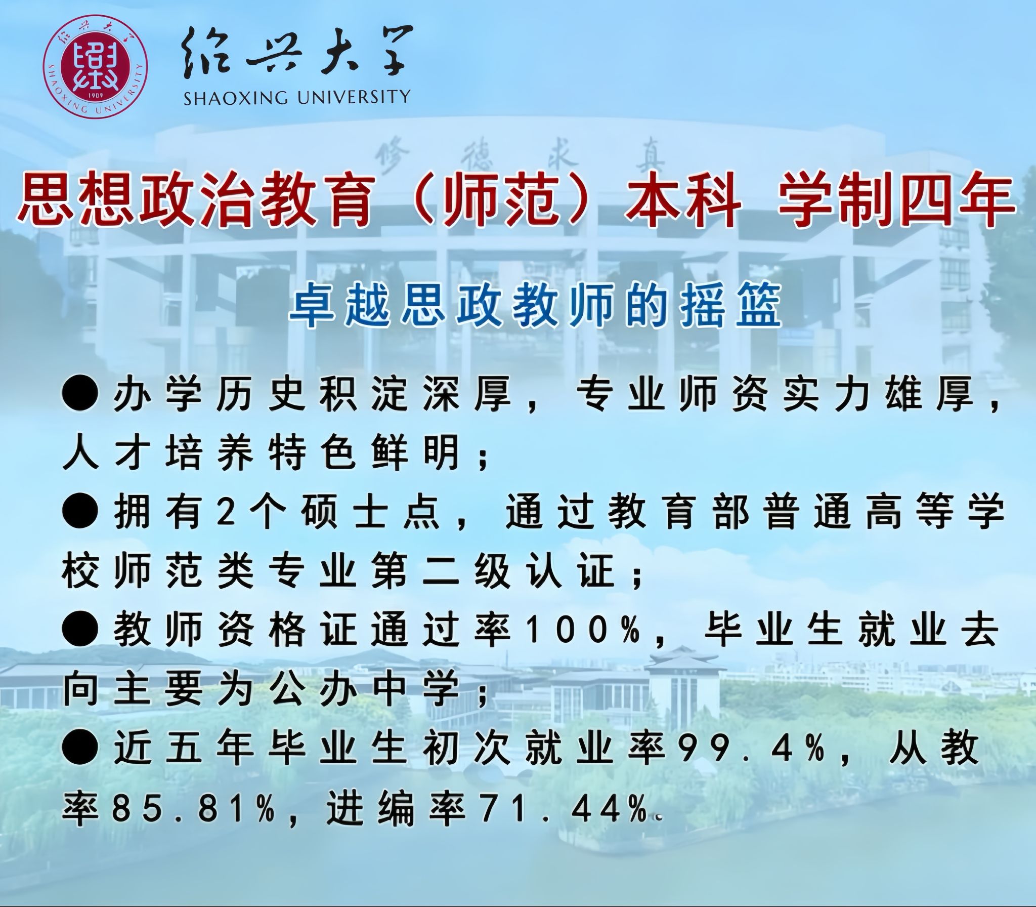 思想政治教育(师范)专业是我校的传统优势专业,绍兴市重点建设专业和学校优势特色专业。1996年开始招收本科生,2019年通过教育部师范专业认证,已有26届本科毕业生。本专业的人才培养凸显政治性、强化师范性、注重学术性,围绕“思想政治”专业性质和“师范性”培养方向特点,以“师德、知识、技能、素质”为核心,培养的学生专业素养高,综合素质优,社会评价好。近五年毕业率为100%,国家教师资格证考试通过率100%,教师考编录取率70%左右。毕业生先后考取复旦大学、中国人民大学、中国社会科学院大学、南京师范大学等高校硕士研究生,在全国和省“挑战杯”大学生创业计划竞赛、浙江省“卡尔·马克思杯”大学生理论知识竞赛、浙江省师范生教学技能竞赛和浙江省思政微课大赛等学科竞赛中屡创佳绩。