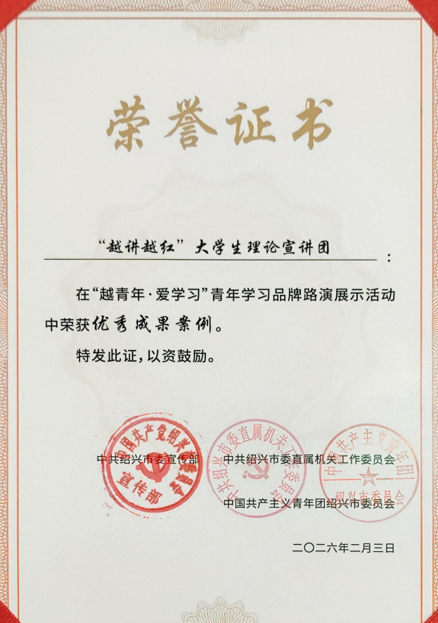 此次入选是对宣讲团工作的充分肯定与有力激励。未来,“越讲越红”大学生理论宣讲团将持续深化理论宣讲创新,完善青年人才培育机制,以更接地气、更具活力的传播方式推动党的创新理论落地生根,为绍兴加快建设产城人文融合发展的共富示范市贡献青春智慧与力量。