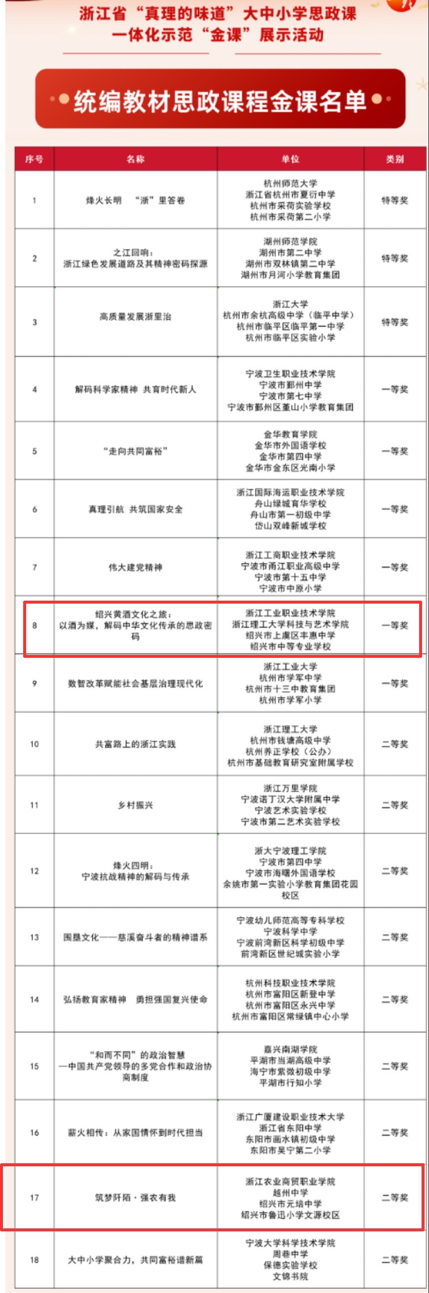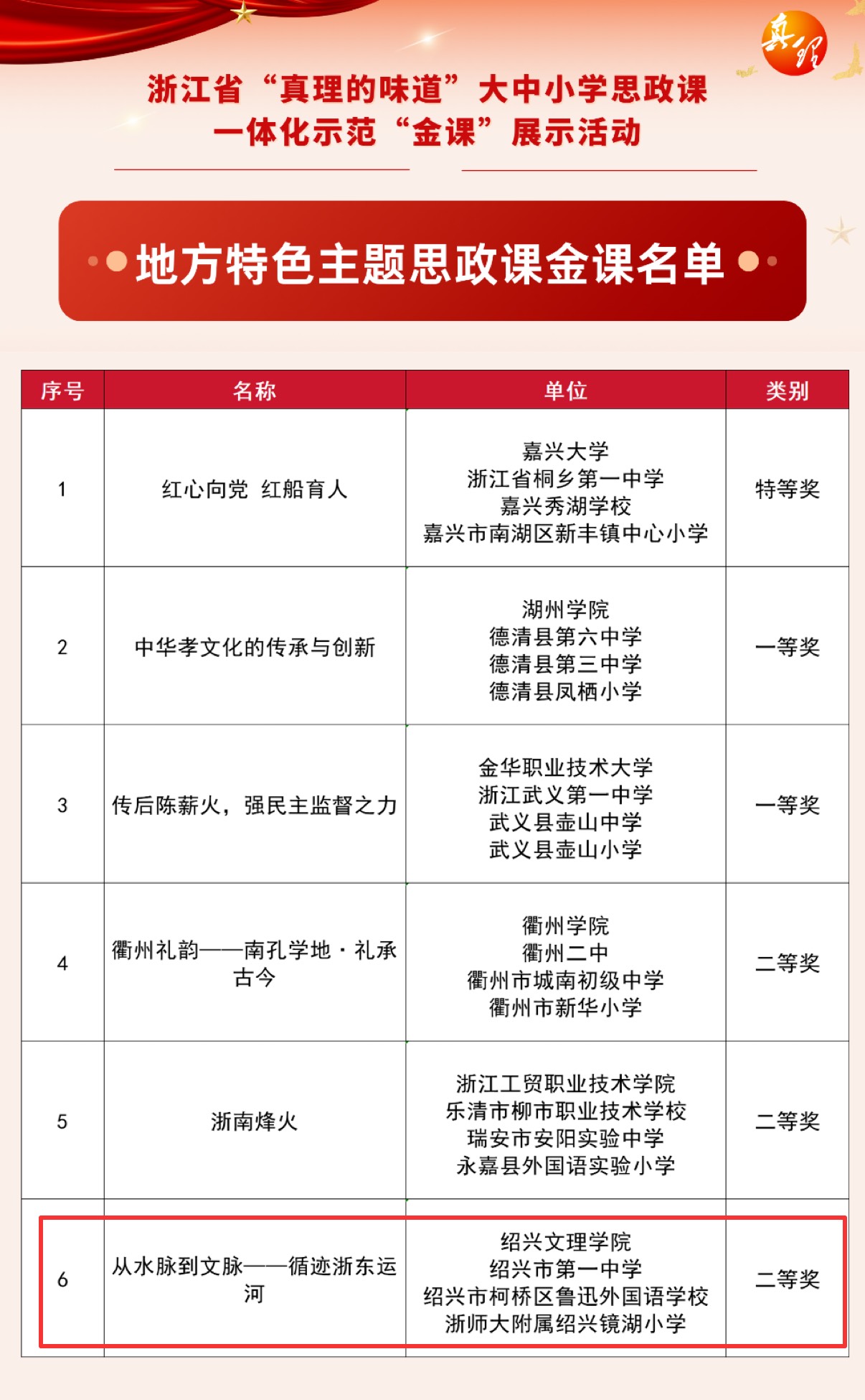 近日,浙江省“真理的味道”大中小学思政课一体化示范“金课”展示活动暨全国大中小学思政教育一体化学术研讨会顺利举行。共评选出特等奖4个、一等奖10个、二等奖14个,其中绍兴市三组教学课程脱颖而出,成功获评思政“金课”。